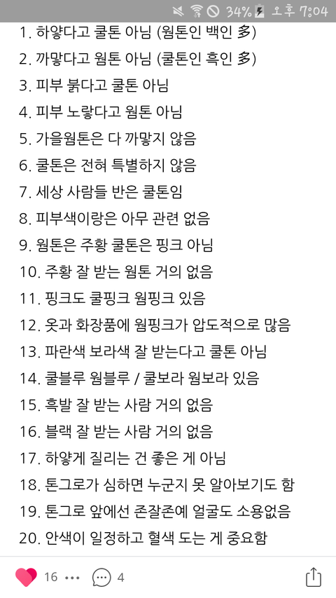 내가 피부 그냥 전형적인 황인종임 근데 주황색이나 갈색 벽돌색 손목에 딱 갖다대면 웜톤이라구 하고 잉크파랑 핫핑크 이런거는 쿨톤이랑 어울리는거라며... 근데 나는 얼굴이 노란편이라 베이지 계열 옷 잘못입으면 더 노랗게보이고 코랄이나 오렌지 립도 잘못바르면 얼굴 노랗구 칙칙해보임... 어쩔때는 핑크가 잘받을때도 있고