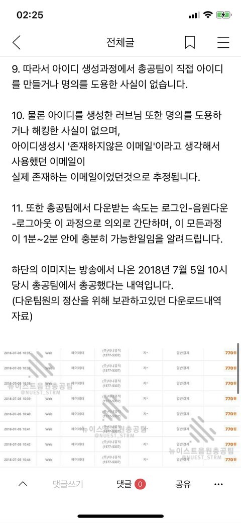 음원 사재기의 경우, ‘수익’을 목적으로 누군가의 부탁을 받아, 명의를 도용했을 지도 모를 아이디로 자신도 모르는 사이 스트리밍이 이뤄진다. 그러나 팬덤 총공의 경우는 수익 목적 없이 ‘자발적’으로 이뤄진다. 그리고 팬은 없는 이메일 넣어도 된다니 이메일은 아무렇게나 써서 넣고 나머지 개인정보는 자신 것으로 (폰번호 등) 채워 아이디를 만들었고 뉴이스트 팬들의 돈으로 다운로드 결제했음. 따라서 업체에 돈주고 스밍돌려달라고 부탁한 것과 같지 않음.