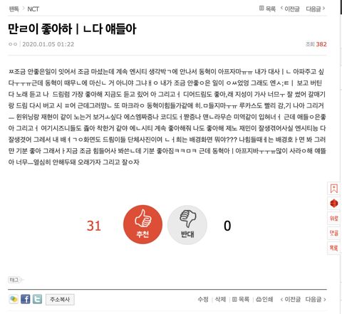 눈뜨자마자 할일이 있어서 다 끝내다가 오늘은 팬톡에 뭐가 올라왔을까 하고 들어왔거든? 근데 막 오타난 제목이 떠 있는거야 그래서 눌러봐서 시즈니 주사 귀엽다고 보고 있었는데 웬열 나였네 필름 완전히 끊김 아 진짜 오바 미안해ㅠㅠㅜㅠ아 미쳤나봐 진짜로ㅠㅠㅠ쪽팔려서 내리고 싶긴 한데 그냥 미래의 나한테 작작 쳐마시라고 경고로 놔둬도 될까...? 근데 내가 진짜 동혁이때문에 속상했나보닼ㅋㅋㅋ이해찬 아프지 말고 엔시티 아프지 말고ㅋㅋㅋㅋ아 웃긴데 슬프네 아 나 미쳤나봐 얘들아 댓글들 다 고마워 기분 완전 나아졌어 미안해 좋은 하루가 되길 바랄게 다들 감기 조심해 아 나 미쳤나봐