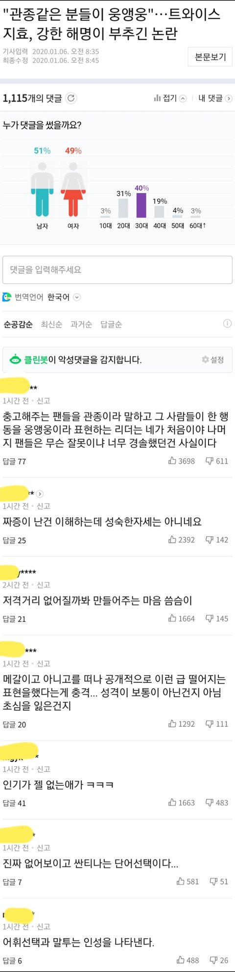 지금 네이버 메인에 있는 기사인데 베댓 추천수봐