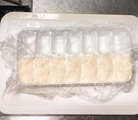 발라주며 약한불에서 굽는다.꼬치가 다 구워지면 불을 끄고 잔열로 조금더 지져준다. 집에 있는 얼음판(깍두기형도 상관없음, 몇번 사용하지도 않을 초밥틀보다 나름 쓸만)에 넉넉히 랩을 칸칸이 찝어 쒸워주고 촛물로 미리 준비해둔 밥을