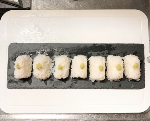 잘 다독여 가며 채워준다.그리고 원하는 그릇에 뒤집어 랩을 당겨 얼음판에서 이동한후 깔끔이 정돈해 주고 와사비를 취향대로 찍어준다.밥이 준비되면 좋아하는 회를 올린다.