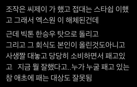 맨 처음에 조작 논란 났을 때 씨제이에서 무작정 귀막눈막 강행해놓고 컴백 인터뷰에서 한승우보고 조작관련 인터뷰 답하게 시켜서 그때 한승우만 대중들하고 떨앰들한테 ㅈㄴ처맞았지?