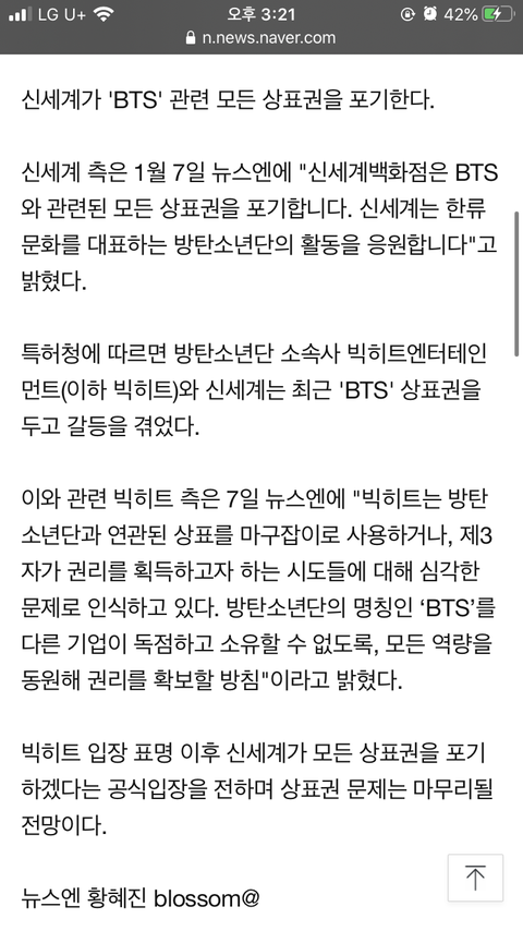 네1이트 메인 기사 ➖ 빅1히트, 신1세계 'BTS' 상표 출원 시도에 "심각한 문제로 인식"(공식)