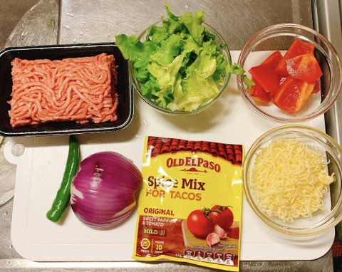 재료는 집에 있는 야채에 다진 고기와 타코 씨즈닉만 구입하고 한국산 청양고추도 준비했다.