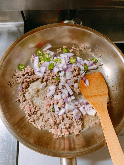 준비한 청양고추와 다진 양파를 넣고 볶는다.