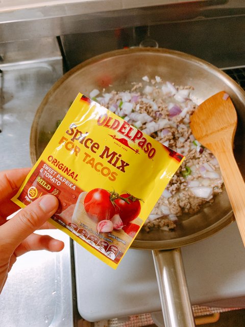 양파가 투명해질 때쯤 구입한 타코 씨즈닉 하나를 모두 넣는다.
