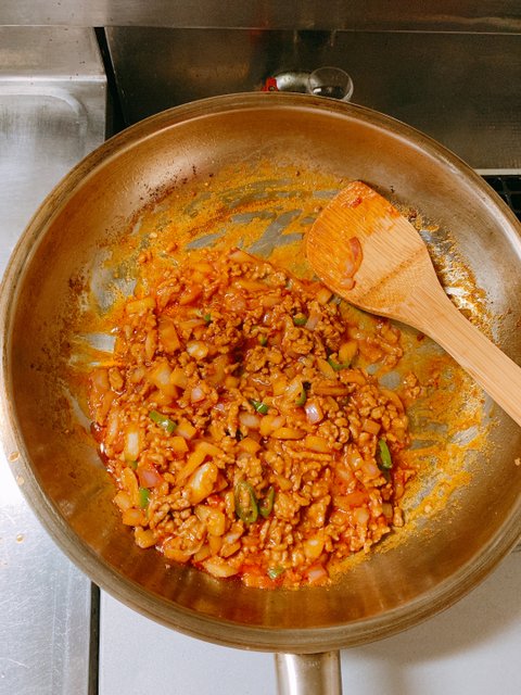 치즈가 녹은 매코한 미트 소스가 밥과 함께 궁합이 참 잘 맞는다.