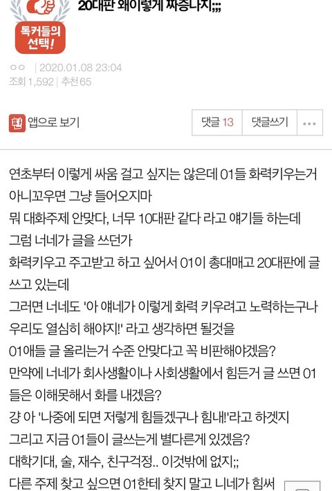 7. 지켜보던 20대 중 하나가 개빡쳐서 댓글달았는데 그게 어찌어찌 추천모아 베댓끝자락 가게됨 근데 그렇게 올라간 베댓보고 화력 모으기 힘든 20대들이 글보고 본문+추천수에 빡치기 시작한거 결국 그 베댓이 1등 먹고 본문(01)추천vs베댓(20대중후반)추천으로 댓글난장판됨 + 그와중에도 최신글에서는 꼰대짓하지말라는 글 등장