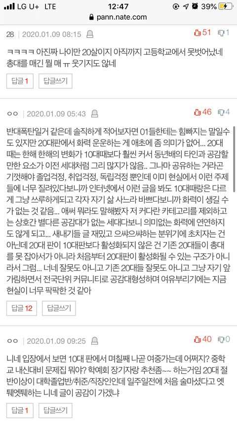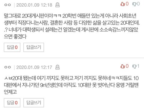 3. 어제 명전에 20대판이 활발하기 힘든 이유에 대해 올라옴(이글 본문은 문제 X) 거기서 댓글로 본문에 공감한 20대들이 20대 중반만돼도 매 해마다 차이 크게 느껴서 요즘 20대판 별로 재미를 못느끼겠다, 너무 새내기 위주라 적응을 못하겠다고 댓달게 됨 (비난보다는 비판에 가까운 내용이었음 궁금하면 찾아봐)