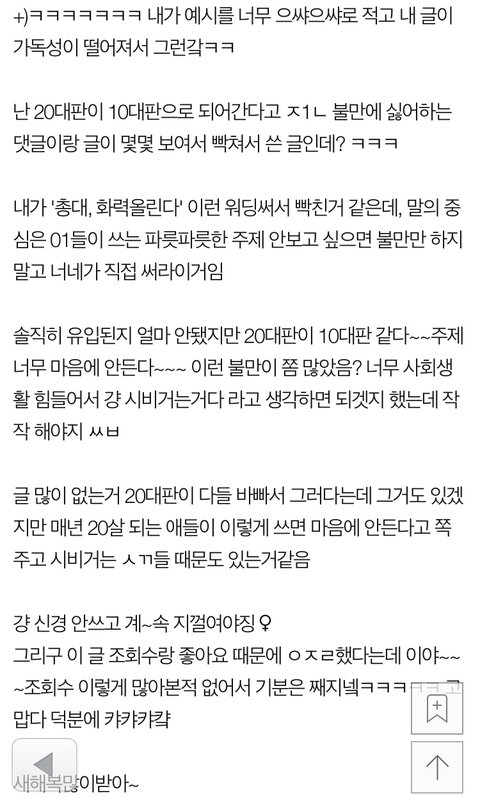 2. 근데 몇일째 톡선이 01들 들어와 01들 어쩌구 20학번 어쩌구로 “01”만을 위한 글+조회수&댓글얻으려는 뻘글이 도배되기 시작함 정작 본인들은 20대판 살렸다고 뿌듯뿌듯 (당연하게 01~00 뉴비 제외한 다른 20대들 글은 뻘글로 다 묻히고 있었음 원래 20대 게시판은 취준/직장인 특성상 느리게 굴러가는 분위기+존대였는데 존중 못함)