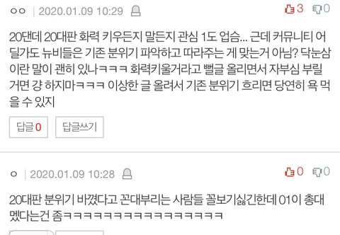 1. 연말부터 01끼리 20대게시판 살리자고 플래그 세워서 01들 우르르 몰려옴 처음에는 20대들도 반가워서 질문글이나 정보글 공유하면서 잘지냄