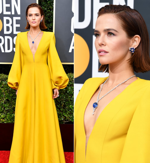 드레스처럼 보이는 점프 슈트를 입은 조이 도이치.