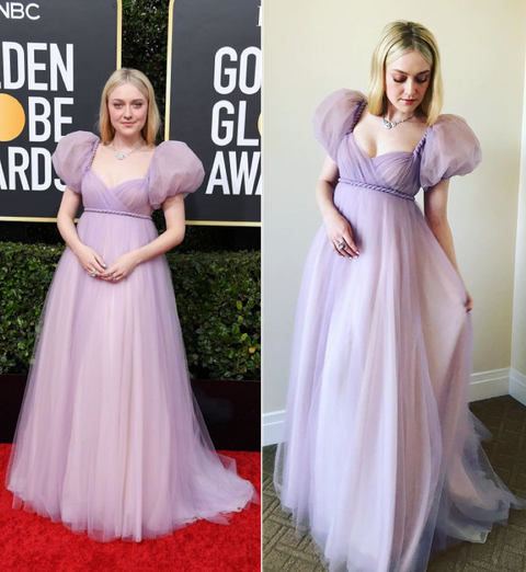 다코타 패닝은 풍성한 퍼프 소매 드레스를 입었다.