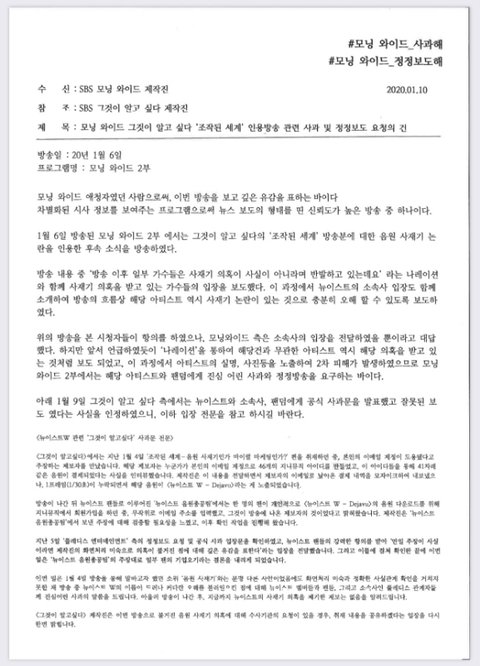 *1월 4일 그것이 알고싶다, 1월 6일 모닝와이드 2부 (두 프로그램 모두 민원 작성)