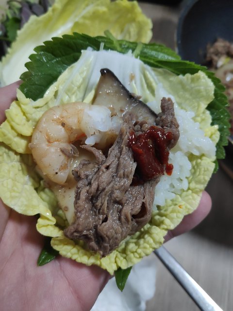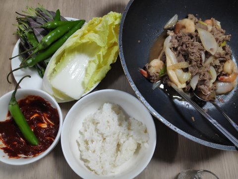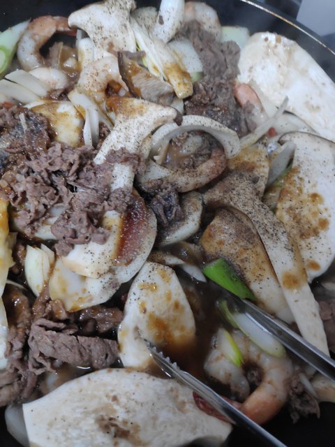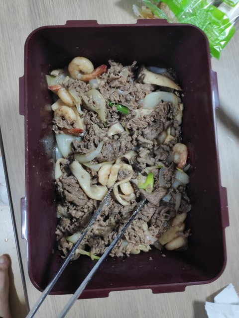 양이많아 궁중팬 3번 돌려서 만든것이며, 소고기2kg, 새우 1kg, 양파 큰거 3개, 새송이 2봉, 등등 넣었습니다. 양은 10리터 김치통 반차네요..요리해논건 5~6리터 입니다. 나눠담으면 보름은 매끼 먹어도 되겠네요..