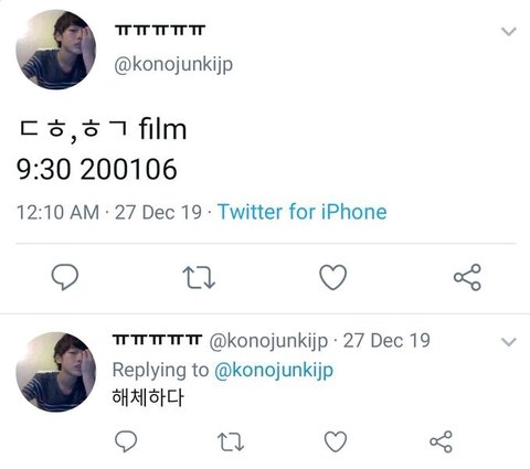 이거 해체 하기전 12월에 올라왔었던 트윗임 도현 한결 film 9시 30분 200106 라고 적고 멘션에는 해체하다 라고 적어둠