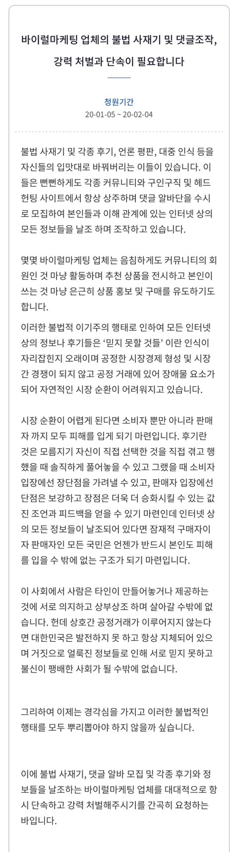 ‘사재기’ 뿐만 아니라 댓글 알바 모집 후 ‘댓글 조작’, ‘거짓 후기 작성’과 같은 사기에 가까운 일들을 수시로 범하는 바이럴마케팅 업체들의 제재 및 집중 단속과 엄벌을 해달라는 청원글이야 꼭 한번씩만 동의 눌러줘!