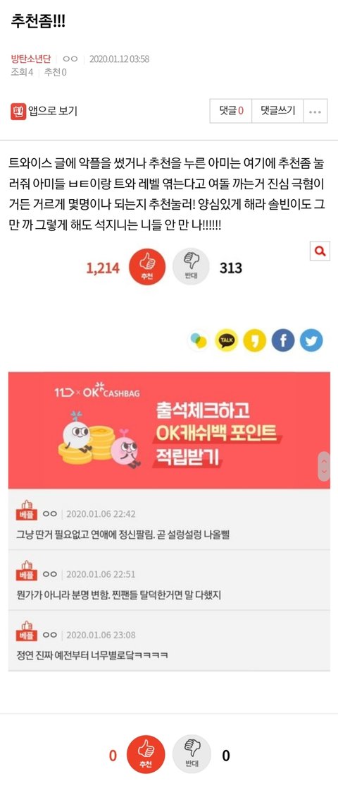 여돌 좀 놔줘 아미야 악플 좀 그만달어 견제좀 그만해 탄이들 너네 안만나줘!!