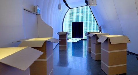 러시안 아트 그룹인 "blue noses" 의 "fifty years after our common era" 혹은 "handbag's revolt". 저 상자 안에는 발가벗은 여인들이 일정한 동작을 반복하는 영상이 나옴. 이중의 한 상자에서는 한 여인이 빨간 샤넬 백으로 다른 한 여인을 친다고 하네요 ^^;;
