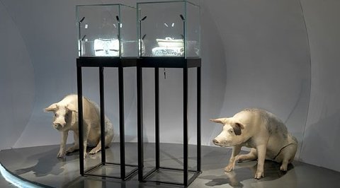 벨기에의 wim delvoye. 저 돼지들 등에는 문신이~ 이 작품의 이름은 "jeses, love & chanel bag"