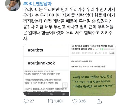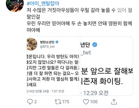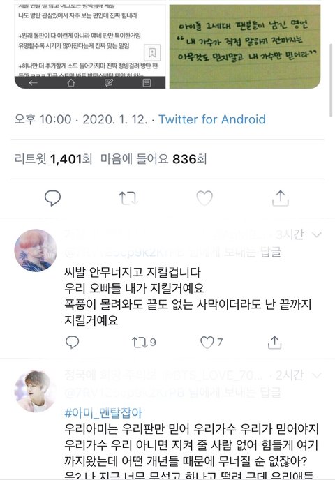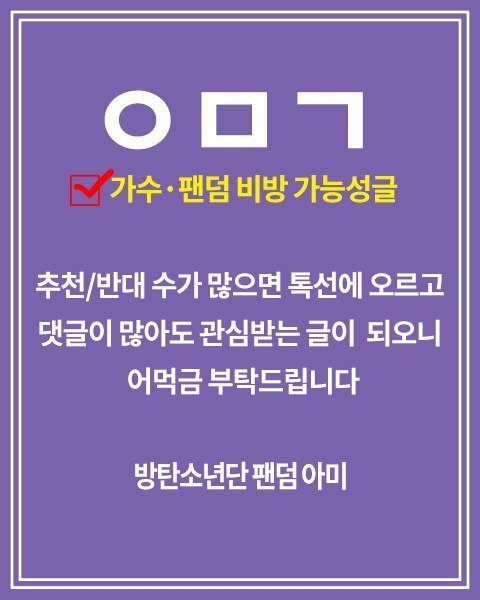 으..ㄹㅇ별 타격 없는 일가지고 초딩 아미들끼리 지들갬성 폭팔해서 온갖 오글거리는말 주고받는중..보다가 조카 오글거려서 걍나감 애들아 미적분이나 풀으러 가렴..