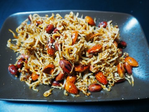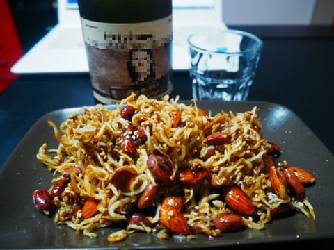 냉동실에 실치가 있어서 어떻게 할까하닥 견과류를 넣고 볶았는데... 생각보다 너무 맛있어서 계속 줏어먹다가 급기야 안주로... 나름 생선이니까 화이트와인으로...
