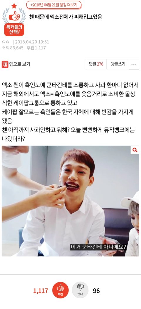 첸이 제대로 사과를 하게 엑소팬들이 자체적으로 피드백을 요구 했어야 하는데 엑소팬들은 쉬쉬하며 조용히 넘어가고 돌팬들은 모두 분노했던 사건임