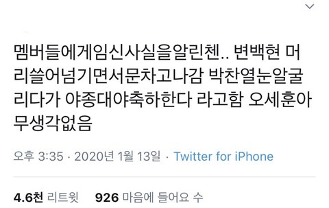 팬도 아닌 애가 캐해 해석하니까 다 틀려먹었지 ㅋㅋ 변백현은 한소리하고 나갔다가 다시 와서도 뭐라할 타입이고 준면이는 표정 싹 굳어서 분명 엄청 뭐라해서 축복애비랑 말다툼 있었을거 뻔하고 찬열이가 뭔 야 축하한다야ㅋㅋ 걔 그냥 암말 못하고 눈 굴리면서 준면이 눈치볼 애고 세훈이 무표정으로 바닥 보면서 혼자 속으로 오만 생각 다 할 애고 종인인 여기저기 눈치보다가 한숨 쉬고 조용히 자리 뜰 타입이지 축복애비는 지 의견 안굽히고 다 맞받아치고 결국 지 하고 싶은대로 하는 타입ㅋㅋㅋ 이와중에 세훈이 생각 없이 사는 애로 만든거 같아서 개빡치네 그렇게 생각없이 사는애가 흔한 말실수 논란도 없겠냐 이제 와서 하는 말이지만 걔가 왜 김다정인지도 솔직히 ㅈㄴ이해못하겠었어 그렇게 부르는 팬들도 이해 못하겠더라 걔가 언제 다정했냐? 말투만 다정했지 하는 말들이나 행동 보면 다정한거 ㅂㄹ 없었어 걔보다 변백현 김준면 김종인이 훨씬 다정했고 잘해줬다