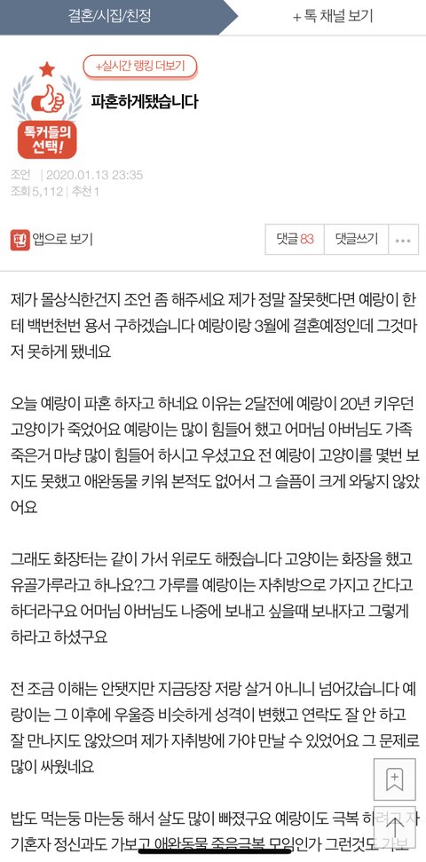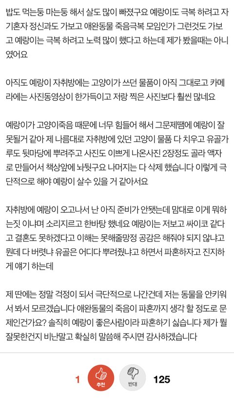 나도 동물은 안 키우지만 20년이나 같이 지낸 동물이 죽었으면 동물이 아니라 가족이 죽었다고 생각할것같은데 그런 공감능력이 없다니....고양이가 동생이라고 가정했다면 여자친구가 동생의 유골을 허락없이 자기멋대로 가져가서 아무대나 뿌리고 가지고 있던사진도 다 불에 태워버리고 지가 괜찮다고 생각한 사진 2개만 놔둔 것이나 다름없네 소름...파혼뿐만아니라 고소를 해야 마땅한거 아닌가