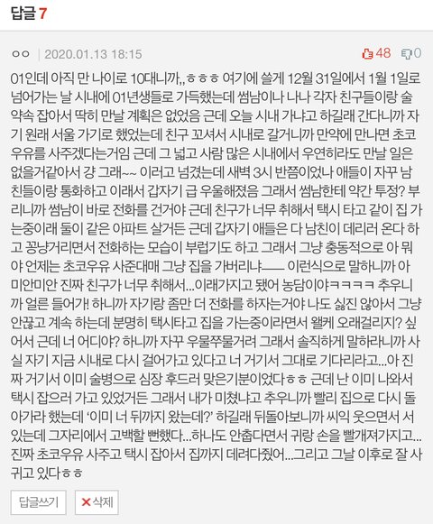 내가 어색한걸 진짜 싫어하거든...그래서 한 10분? 정도밖에 안걸리긴 했지만 이런저런 얘기를 많이 했어 그러다보니까 셋 다 어색함도 없었고 나도 원래부터 알던 사이마냥 열심히 수다를 떨었지ㅎㅎ 그리고 집에 도착해서 데려다줘서 고맙다고 하고 남자애한테는 만나서 반가웠다고 인사한 다음에 집으로 들어왔어 물론 잘생기긴 했지만 나는 고3이었고 당장 나한테 입시보다 중요한건 없었어 그래서 그 애랑 연락을 하고싶다거나 가까워지고싶다거나 하는 생각은 딱히 안했던 것 같아
