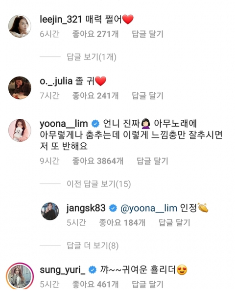 옥주현, 이진, 성유리는 '매력 쩔어~' '귀여운 울 횰 리더'등의 댓글을 남겼고