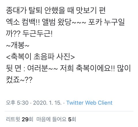 + 자다일어나니 톡선이구나 종머는 순산하길 바라고 돌고돌아 결국 찐사랑만 남은 ex7 롱런하자 내가 처음볼때보다 반토막이 나버렸지만 마음은 비교도 안될정도로 배의배의배가 됐어 너네도 엑소엘이 단 1명이라도 있다면 춤추고 노래하겠다했으니 나도 너네가 1명이라도 남아있다면 언제든지 계속 팬이야 내 10대 모든 학창시절이 너네야 앞으로도 눈물나게 사랑하자 종머때문에 앞으로 너네한테 어떤 타이틀이 붙던 ‘엑소’란 이름 자체만으로 자랑스럽다