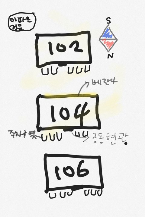 '우리집 베란다에서 정면으로 보이는게 102동이고 아파트 정문을 기준으로 102동이 앞이다'