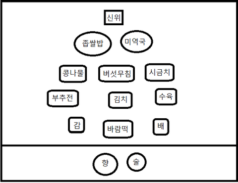 - 밥 : 흰쌀밥이든 잡곡밥이든 고인 좋아하시던대로. 딱히 가리시던 거 없는 분이시면 그냥 가족들이 좋아하는 쪽으로 올려라