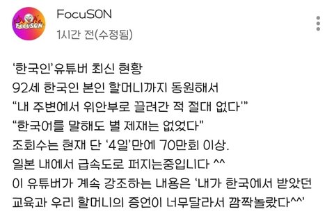 한국남자라는 유튜버가 본인의 할머니를 데리고 나와서 한국인들이 주장하는 일제강점기의 피해사실은 모두 거짓이다