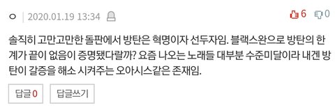 케바케겠지 아미인데도 별로라고 생각할수도있고 취향이잖아 나도 아민데 갠적으로 이번 노래 좋음 첨들을때부터 소름돋고 좋았는디 글타고 저 댓글처럼 타가수분들 노래가 수준미달이라곤 생각안함