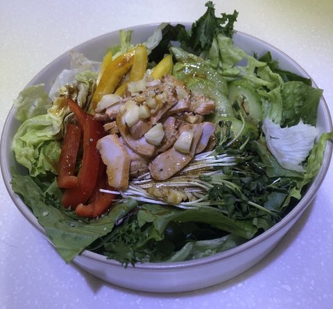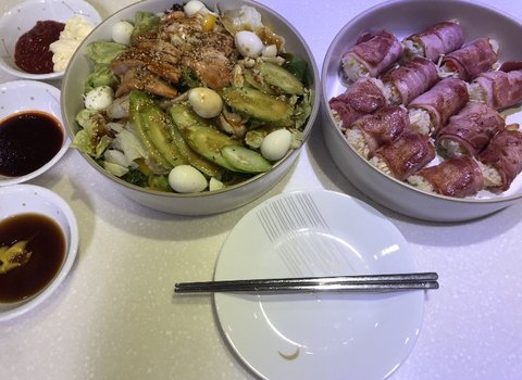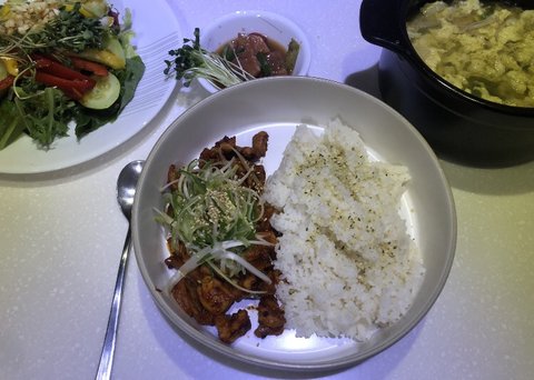 이건 샐러드랑 연어장 닭갈비 덮밥 계란국