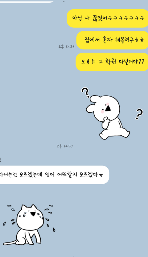 이 뒤에 뭐라고 보낼까 ㅜㅜ?? 내가 다니던 영어 학원을 끊어서 갘이 다니기로했던 친구가 저러케 보낸 상황이야ㅑ멘트추천조뮤ㅠㅠ 대화이어나가기 고자야 글고 너무 애매함 답장보내기..
