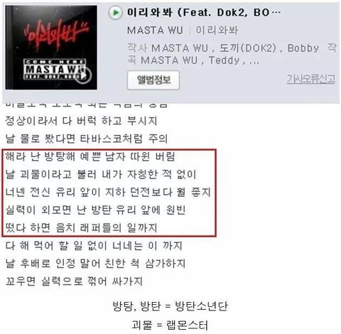 갑자기 생각나네 근데 진짜 어이없었는데ㅋㅋㅋ 디스를 당연히 할 수는 있는데 그때 한참 인기많거나 대형 기획사 아이돌들은 절대 안 건들이고 갑자기 중소도 아니고 소소 기획사에서 갓데뷔한 방탄 빅스 보이프렌드 갑자기 맥락없이 디스한 거 기억남? 그땐 그런갑다 했는데 지금 생각하니까 엑소나 비스트 같은 인기 많은 그룹은 못 건들이고 인기 별로 없는 만만한 애들 디스한 거 좀 찌질해보인다 특히 방탄은 지금도 똑같이 디스할 수 있는지 궁금함ㅋㅋㅋ