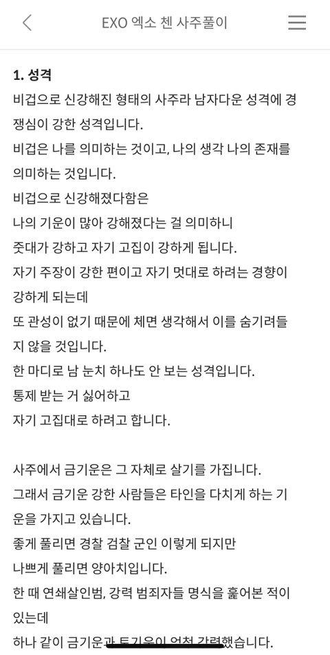 사주 너무 극단적으로 풀이했다 비겁이 많고 관성이 없으면 타인의 간섭,구속 싫어하고 자기 개성 강한건 맞는데 금 기운이 많다고 연쇄살인범 운운하는건 아닌듯 금기운은 보석을 의미하기도해 첸은 그룹보다는 솔로로써 재능을 발휘하는게 본인 사주에 유리한거지 방탄의 알엠도 금 기운이 강한 사주야