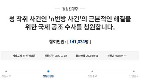 2일 청와대 국민청원 사이트에 성 착취 사건 해결을 위해 국제 공조 수사를 호소하는 내용의 청원이 올라온 데 이어 15일 국회 국민동의청원에도 디지털성범죄 해결에 대한 청원 글이 올라와 청원이 진행 중이다.
