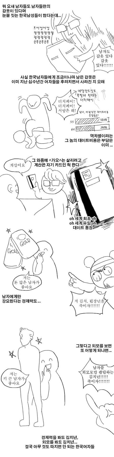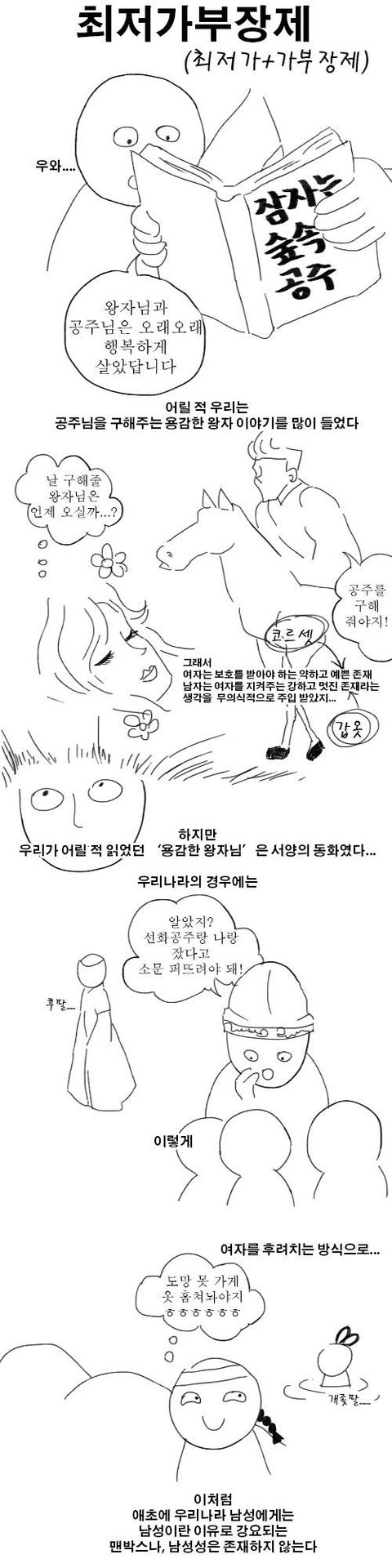 한국 동화들 우화들 풍문들 잘 생각해보면 서양처럼 기사도 정신 강조하는 내용 전혀 없음 오히려 영웅 호걸은 색 밝히고 여자들 여럿 후리고 다녀야 남자답다는 내용만 있지 현대사회에서 남자들에게 주입된 남자새끼가 사내자식이 이런 표현도 생각해보면 여자를 위해주고 보호해주라는 말이 아니라 걍 감정 표현 안 하고 여자 후리고 다니라는 말임 것도 남자 어른들이 남자애들한테 주입한 거 한반도 역사상 서양처럼 여자는 약자니까 보호해줘야 된다는 기사도 사상을 주입한 경우는 단 한 번도 없음 하찮게 여기고 성욕이나 풀 대상으로만 주입시켰지 그래서 한국 남자들이 남자도 힘들어! 남자도 남자답게 굴어야 된다는 사회적 압력이 있어 광광되는 건 걍 코메디임 여자를 위한 것도 여자가 씌운 것도 아닌 여자랑 걍 무관한 프레임일 뿐임