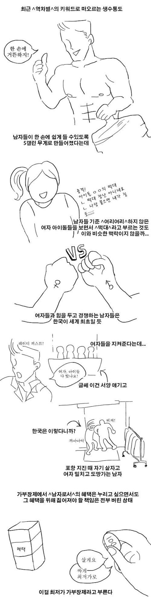 내말이 ㅋㅋㅋ 외국은 남자가 여자는 아무것도 할 수 없는 존재라고 여기며 하나부터 열가지 다 자기 마음대로 정하고 그래서 페미들이 나도 할 수 있다!! 이러는거고 ㅋㅋㅋ우리나라는 남자가 여자가 시켜먹고 부려먹기만 함.. 외국 선교사들이 쓴 책에서 보면 조선의 남자들은 하루종일 놀기만 하고 가녀리고 마른 여자들만 온종일 일하기 바쁘다고 써있음. 우리나라 남자들은 아주 오랜기간 개꿀 빨았었다