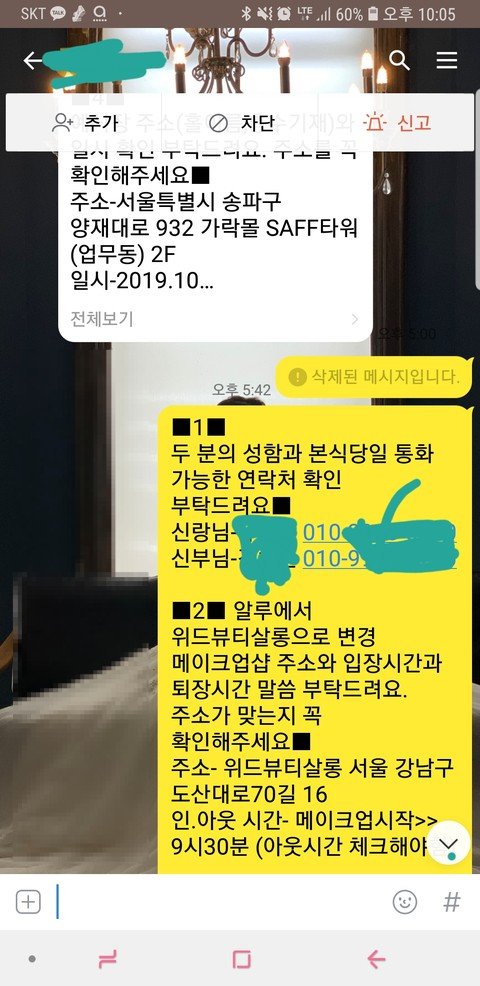 헤어와 네일받고 있는데 연락이 오시더군요. 신랑연락처 알려달라고...
