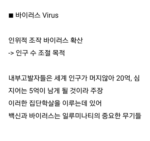 사람이 신종바이러스를 만들어서 인구수줄이려한다고 들었는데...