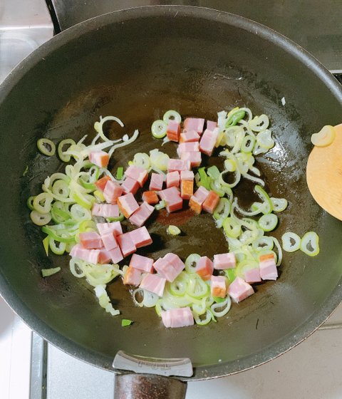 올리브유에 대파로 파기름을 내고 좋은 냄새가 나고 파가 투명해지면 함께 준비한 베이컨을 볶는다.