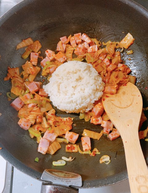 밥이 함께 고슬고슬하게 굴러 다닐때까지 약한불에서 더 볶는다. 여기에 더 이상의 밑간은 하지않는다.