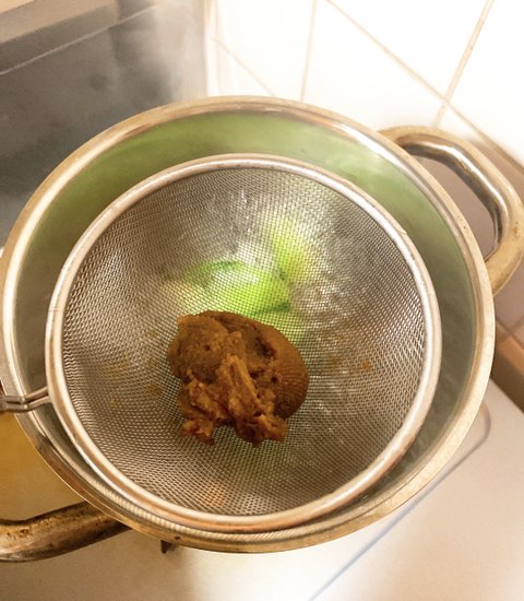미소된장을 채에 넣고 건더기를 거르고 끓어오르면 바로 불을 끈다. 남은 잔열로 청경채의 잎사귀들을 넣어 익혀준다.