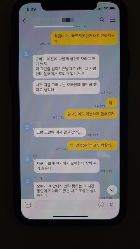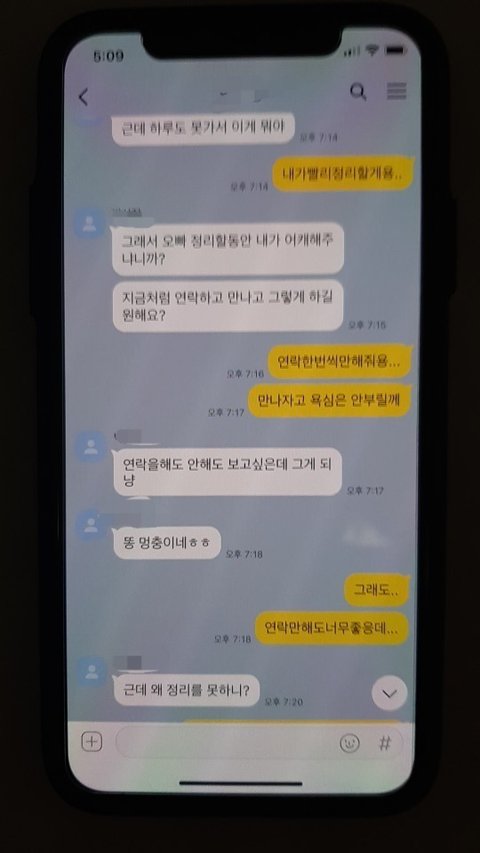 카톡 내용 중 친구가 전 남친에게 나랑 언제 정리할껀지 자기 기분은 생각해봤냐면서 정리하라는 식으로 계속 얘기하는걸. 봄.전 남친 성격상 우유부단해서 이래저래 나랑 헤어지지 못하고 있으니 친구는 계속 재촉하고 또 전 남친은 미안하다는 식으로 얘기를 하는 거임.